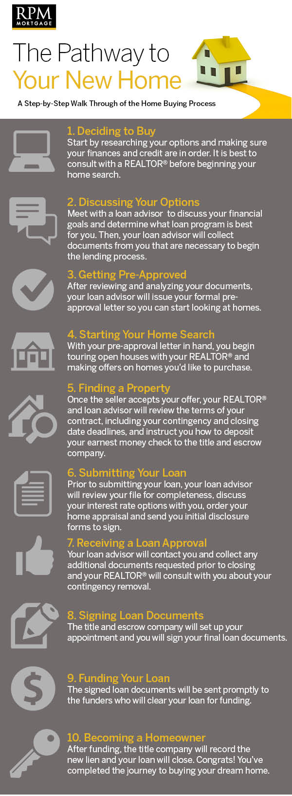 Buying a home for the first time can seem like a daunting process. But it doesn’t have to be difficult. With a little preparation, and the guidance of a real estate agent and mortgage professional, you’ll be well on your way to making the house of your dreams…your home! This easy-to-follow infographic will show you what to expect along the path to home ownership: